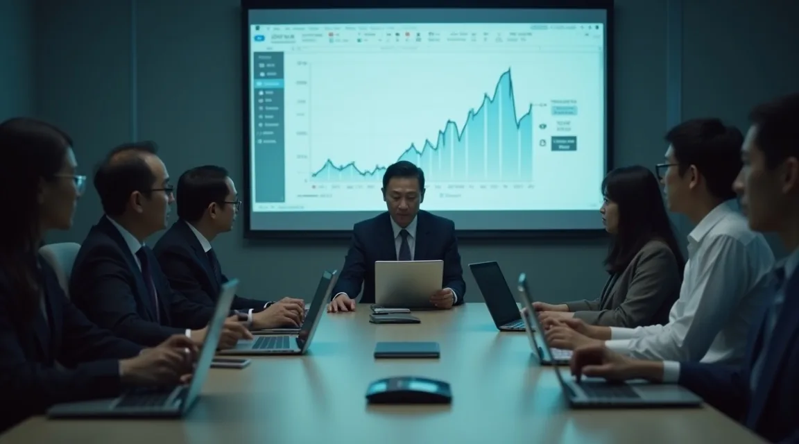 会議室の正面スクリーンには、第3四半期の売上グラフが映し出されている。